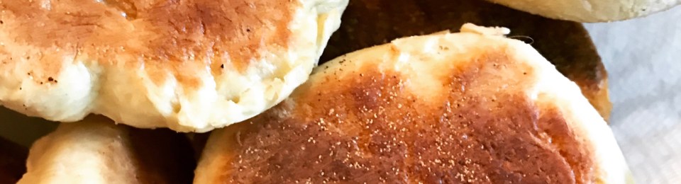 (The recipe calls for the dough to be rolled into balls, allowed to rise a bit, and then flattened, before being placed on griddle – you can try either method.)